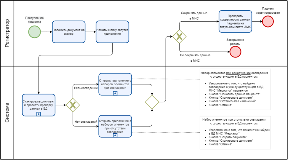 Сканер Promobot взаимодействует с МИС Медиалог через графический интерфейс, выполняет проверку наличия пациента в БД МИС, автоматически создает пациента в системе по результатам сканирования документа и заполняет/обновляет данные пациента на титульном листе ЭМК.